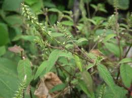 15〜50cmの一年草で茎は四角でです。茎はまばらに分枝し、葉と共に短い毛があります。葉は2〜5cmの長卵形で対生します。枝の先に短い穂状の花序を付け、淡紅紫色で8mmほどの唇形花を付けます。