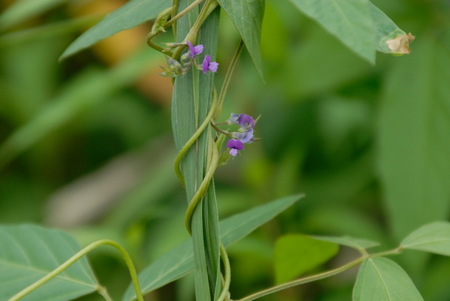 別名 ノマメ。大豆の原種と言われています。秋に紫色の蝶形花をつけます。葉は3出複葉で、狭卵形〜披針形の小葉で、幅が狭いので花の無い時期でもヤブマメと区別できます。果実は淡褐色の毛が密生します。。花期は8〜9月。