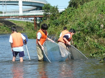 市ヶ尾中学わくわく交流会川の生き物調べ。