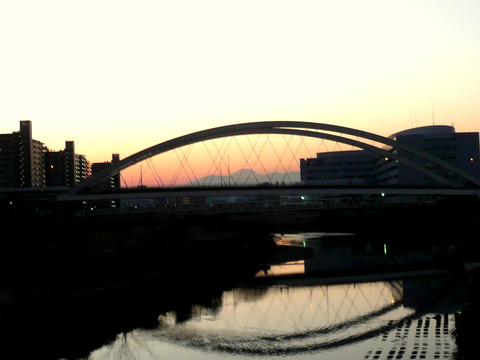 鴨居大橋の夕焼け。丹沢山塊の後ろに富士山の姿が見えました。