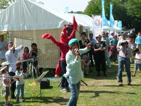 眩しいくらいの新緑の中、白井貴子さんの「マッカチ・カニカニ音頭」に全員参加。大いに盛り上がりました。