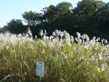 ヤブカラシやカナムグラ,クズなどの蔓性の植物がオギに絡みつき通路を覆ってしまいました。