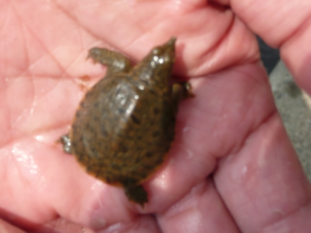 写真はスッポンです。大型の個体が甲羅干しをしているのは何度か見ましたが、子亀は、初めてです。繁殖しているのか?誰かが放したのか?