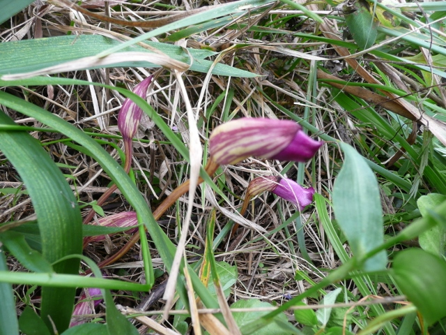 倒れたオギを取り除くとオギに寄生しているナンバンギセルが花を咲かせていました。